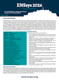 Complementing the topics of CPS-IoT Week 2026, this workshop will bring together researchers and practitioners to explore advances in sustainable, energy-harvesting, and energy-neutral sensing systems for the IoT and cyber-physical infrastructures. These technologies enable applications in smart energy, intelligent transportation, environmental monitoring, and digital sustainability. Recent progress in energy harvesting, intermittent computing, and sustainable hardware–software co-design is driving the transition from battery-powered nodes to self-powered and environmentally responsible devices. ENSsys 2026 welcomes contributions that bridge disciplines — from low-power and energy-aware software design to battery-free architectures, efficient energy conversion, and edge intelligence through TinyML and embedded AI. Topics include materials and circuit design, power and resource management, distributed intelligence, and sustainable architecture, as well as demonstrators and real-world deployments showcasing advances in zero-energy and long-lived sensing systems.